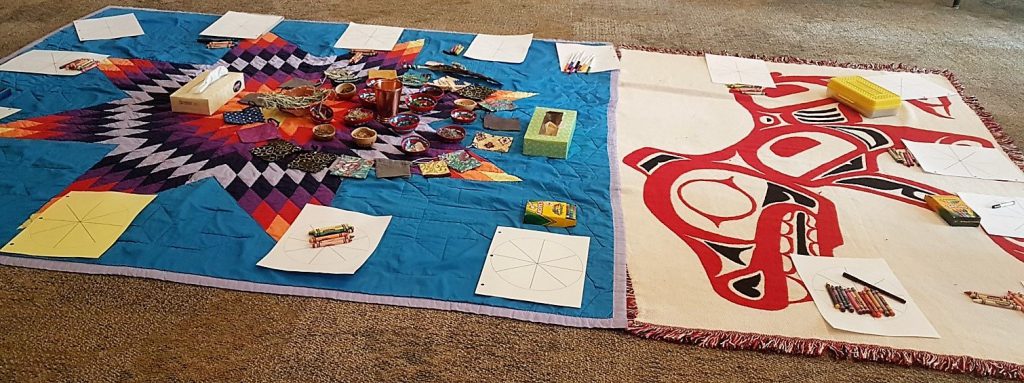Eindelijk is het dan zo ver: Brittany O’Rourke uit Canada geeft haar workshop. Acht vrouwen zitten rondom een prachtig kleed, geborduurd met inheemse symbolen, met daarop van alles uit de natuur. We gaan vandaag kennismaken met een manier van hulpverlening die gebruik maakt van ‘inheemse’ inzichten en tradities en het focussen. We luisteren en doen, zodat we alles met hoofd, hart en handen beleven.